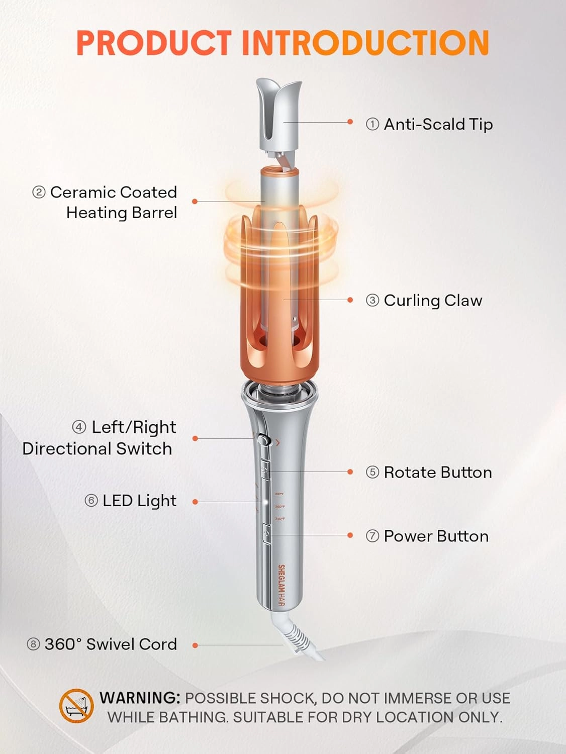 نحوه استفاده: دستگاه را روشن کرده و دمای مناسب را تنظیم کنید. / قسمت های کوچک از موها را داخل لوله دستگاه قرار دهید. / دکمه “One-Touch” را فشار دهید تا دستگاه به طور خودکار موها را دور لوله پیچیده و فر کند. / پس از چند ثانیه با شنیدن صدا بوق، فر موی شما آماده است.